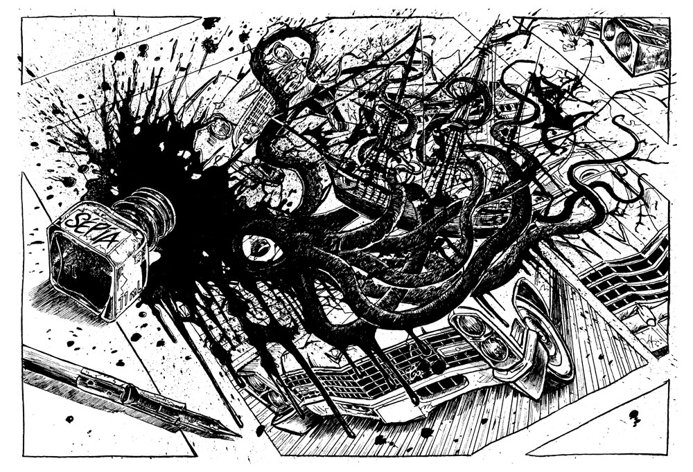 Il s’agissait pour moi de mêler à la thématique que nous développions dans Sépia un hommage au travail d’Alexis, une ouverture vers une de ses prédilections de dessin, les vieilles automobiles américaines. J’étais certain qu’il transformerait ce croquis en une bombe graphique, et je n’ai pas été déçu, voici l’image finale :