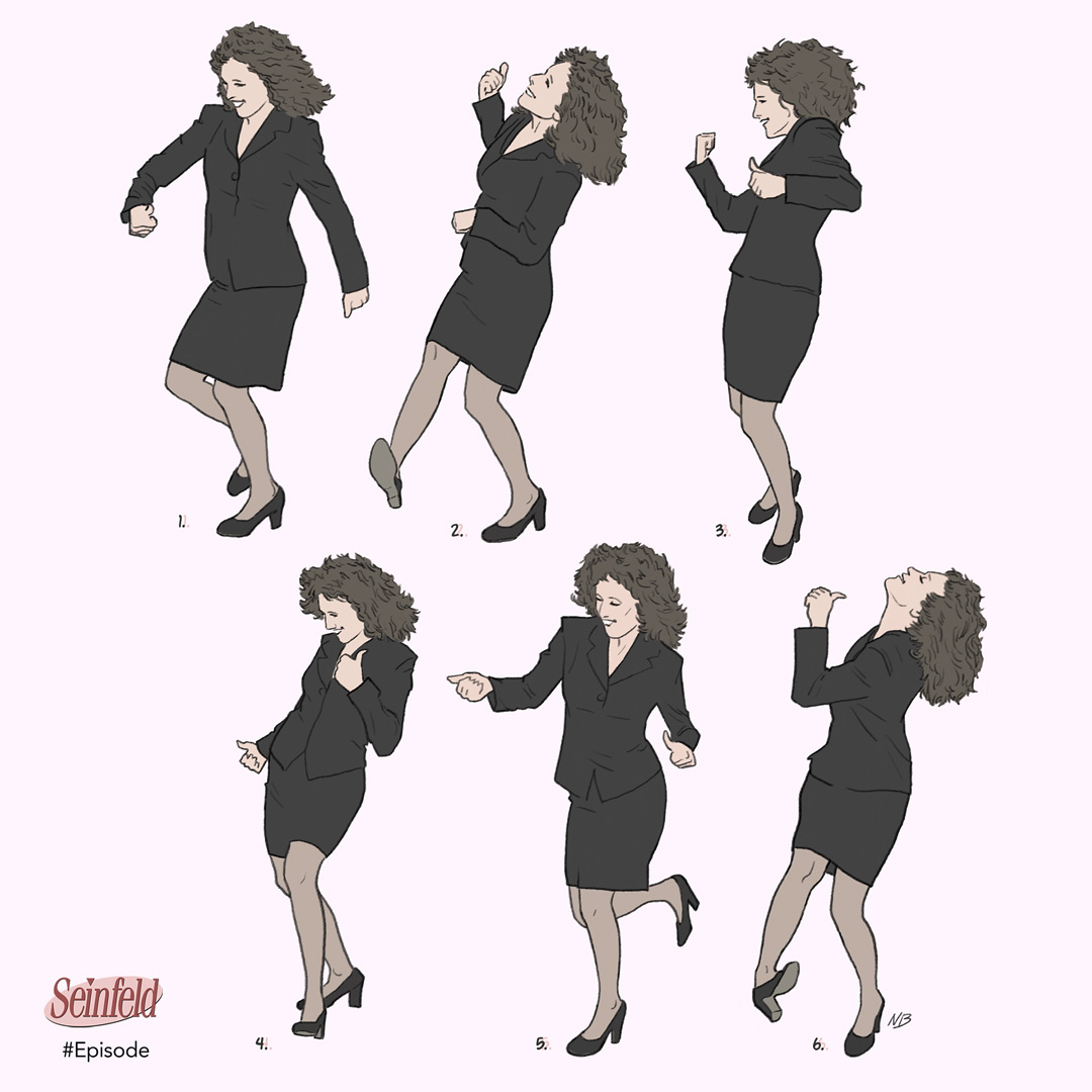 La danse décomposée du personnage de Elaine dans la série Seinfeld, tout d’abord :