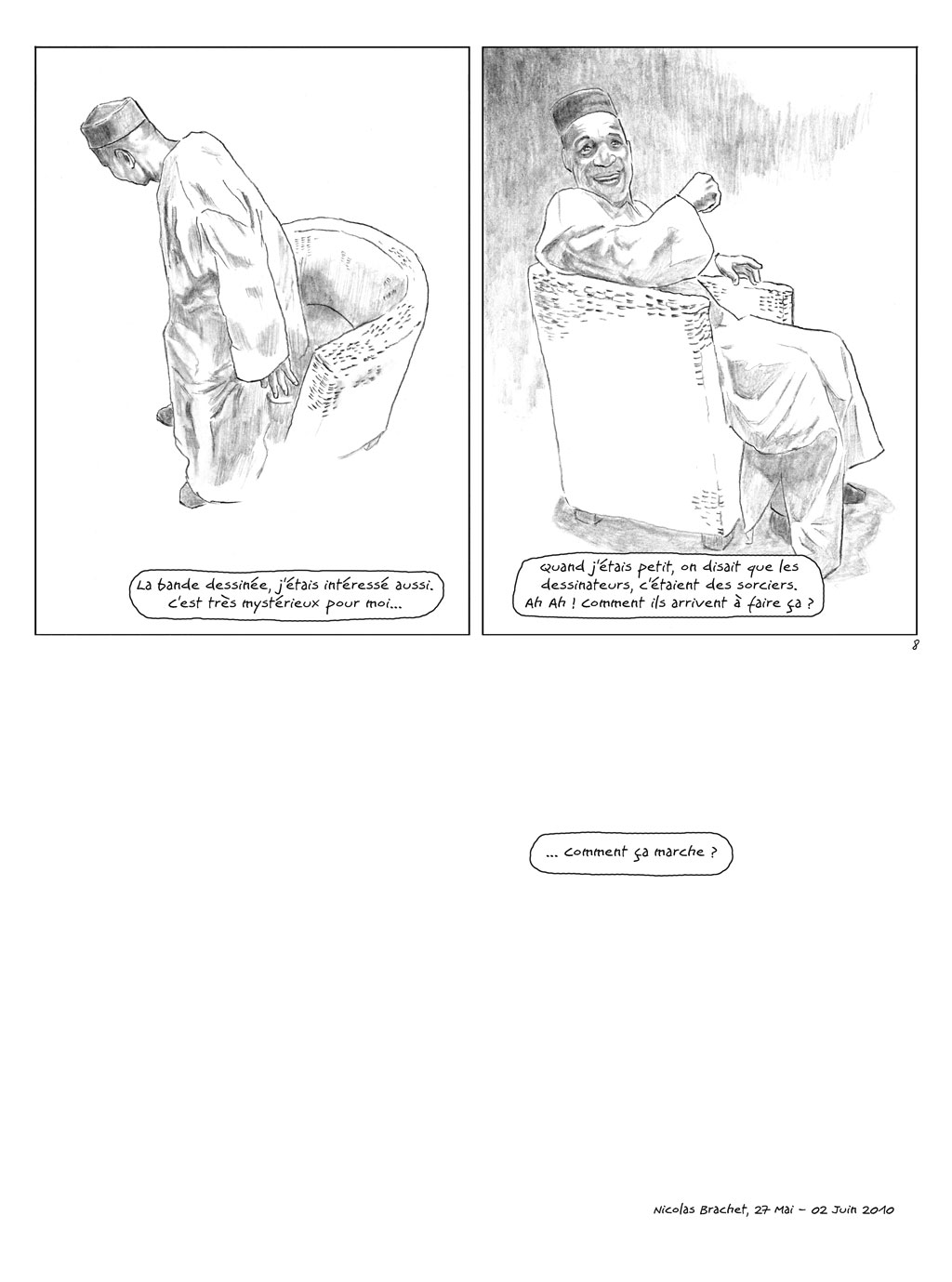 This 8-pages comics has been written and drawn between May 27 and June 03 2010, in the double frame of the Lyon BD Festival Off and of the Passages: Afriques et Créations event organized by the Musée des Confluences.